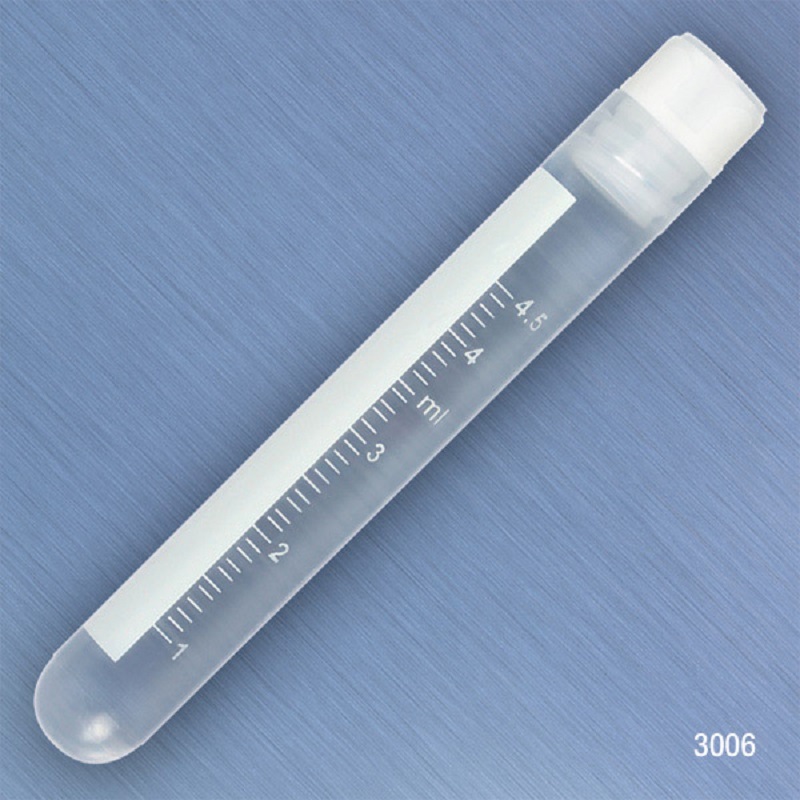 Globe Scientific Part Number 3006-50, CryoCLEAR vials, 5.0mL, STERILE, Internal Threads, Attached Screwcap with Co-Molded Thermoplastic Elastomer (TPE) Sealing Layer, Round Bottom, Printed Graduations, Writing Space and Barcode, 50/Bag, 50 Per Case