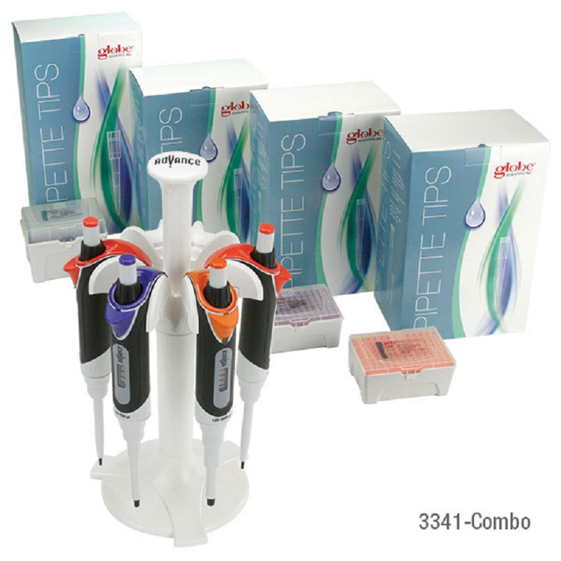 Globe Scientific Part Number 3341-COMBO, Pipette Kit, Diamond ADVANCE Adjustable Volume Pipettors: 0.5-10uL, 2-20uL, 20-200uL, 100-1000uL; Sterile Racked Low Retention Tips: 10uL, 20uL, 200uL, 1250uL and 6-Place Carousel Stand, 1 Per Case